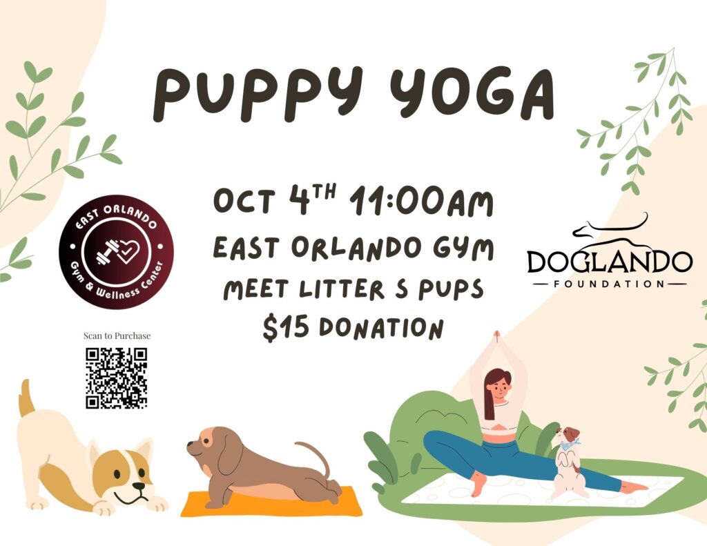 Join us for Puppy Yoga on Saturday, October 4th at 11:00 AM at the East Orlando Gym.